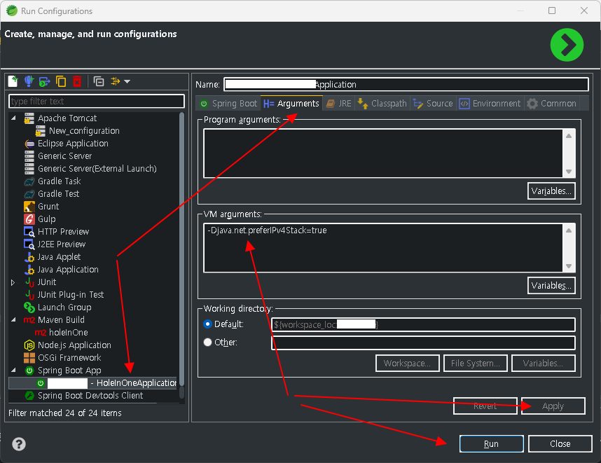 VM arguments 항목에 -Djava.net.preferIPv4Stack=true 입력하고 적용 실행..